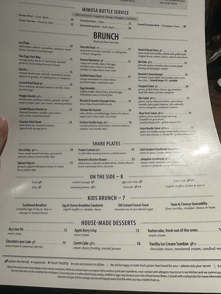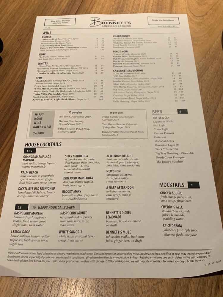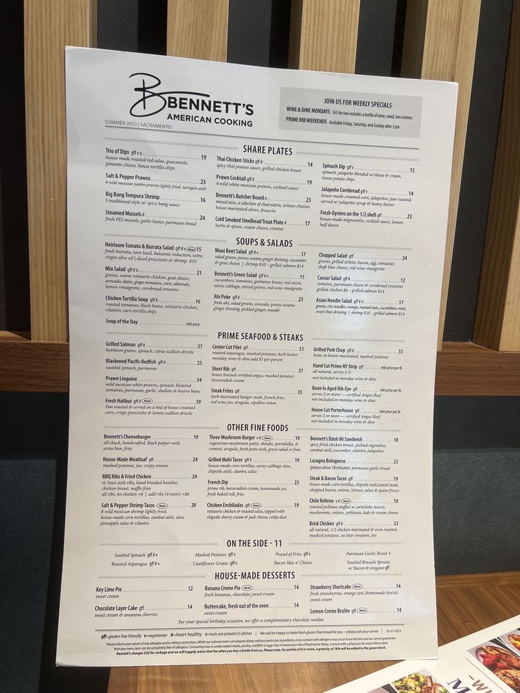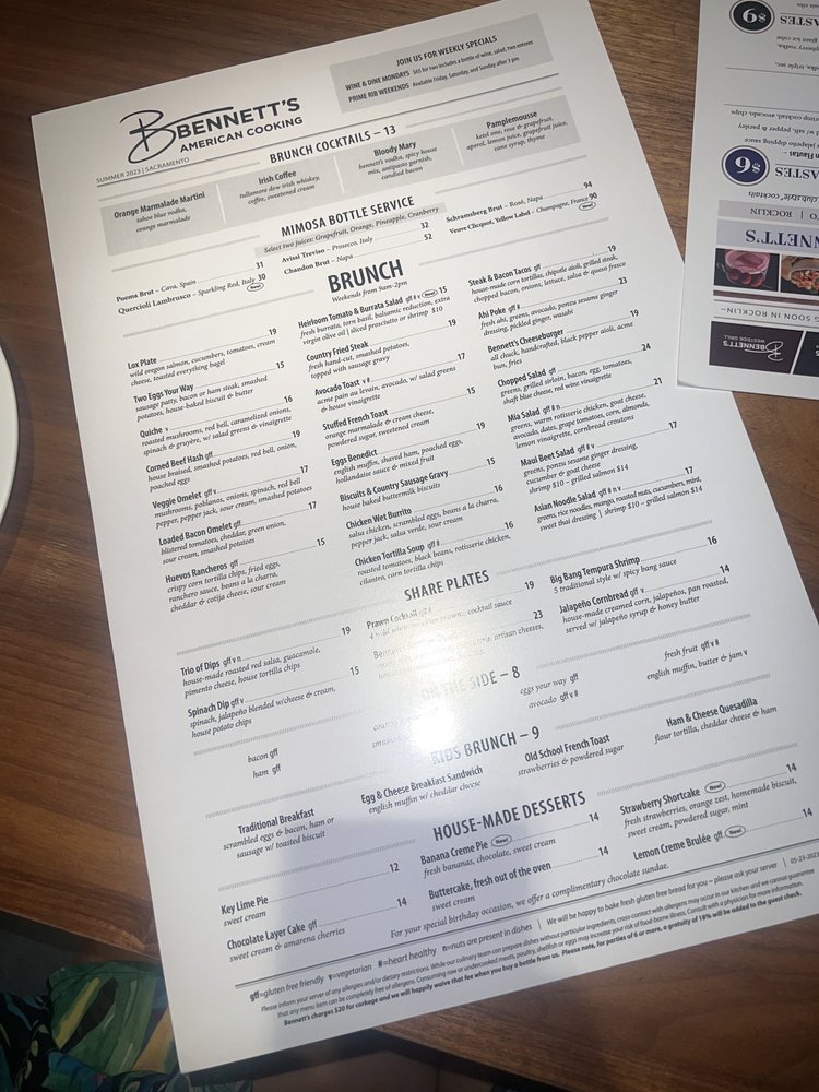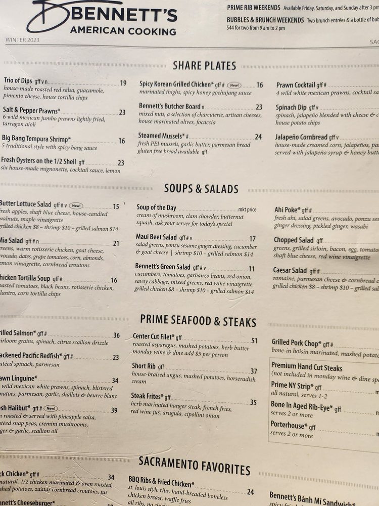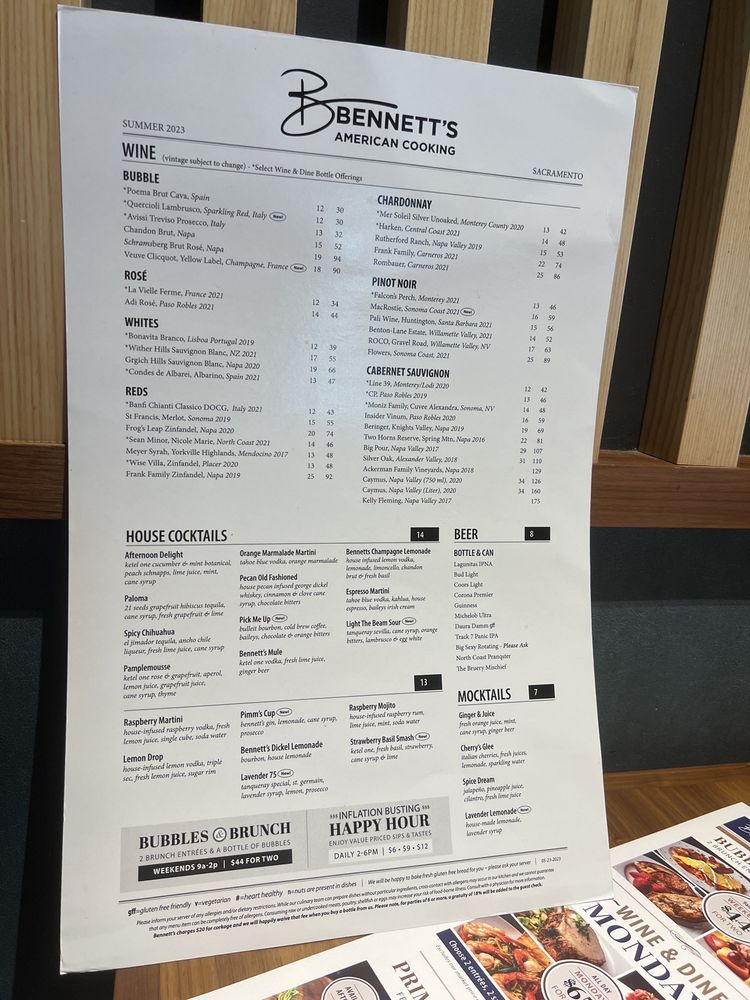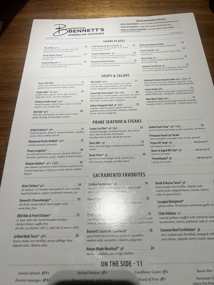 Located in Sacramento, CA, Bennett's American Cooking offers a trendy and upscale dining experience with a focus on New American cuisine. With a variety of vegan options and a commitment to sustainability, Bennett's caters to a diverse range of tastes and values. Customers rave about the flavorful dishes, such as the bone-in ribeye and pork osso buco, cooked to perfection and served with attention to detail. The menu boasts a wide selection of appetizers, entrees, and desserts, ensuring there is something for everyone to enjoy. The attentive service and cozy ambiance add to the overall dining experience, making Bennett's a must-visit spot for those looking for a delicious and memorable meal.